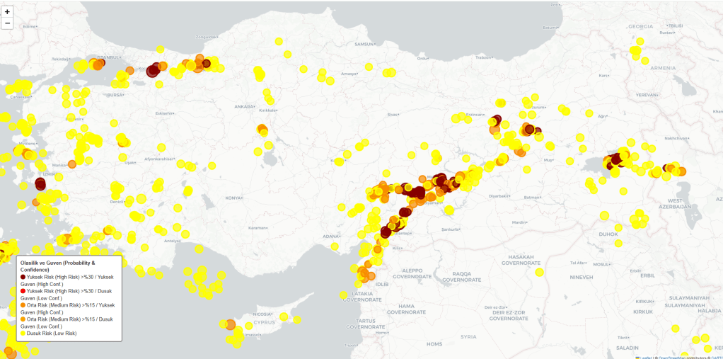- Yüksek olasılık değeri, kesinlikle deprem olacağı anlamına gelmez; düşük olasılık değeri de deprem olmayacağını garanti etmez.